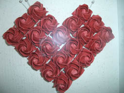 This is a heart-shaped display which made of 21 origami roses. Each rose was made from a red squared origami paper and glued them together to make this heart shape. |